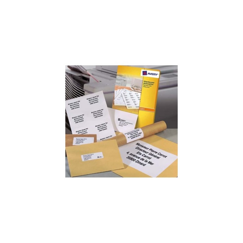 Boîte de 3300 étiquettes Avery - copieur monochrome - 70x26 blanc - DP033 - 100 planches. Conçue pour un passage optimal en photocopieur gros volume. Recommandée pour mailings, messages répétitifs, identification de produits. Étiquette blanche adhésive à angles vifs prédécoupée en planche A4. Spécial copieurs haute cadence !